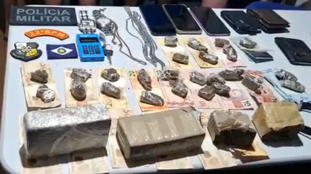 Com os suspeitos, a equipe apreendeu dois tabletes de maconha com aproximadamente 1 quilo cada, outros dois com 250 gramas cada, 27 porções do mesmo entorpecente, dinheiro (quantia não detalhada), dentre outros materiais. Eles faziam o transporte em veículo de aplicativo para não levantar suspeitas.
