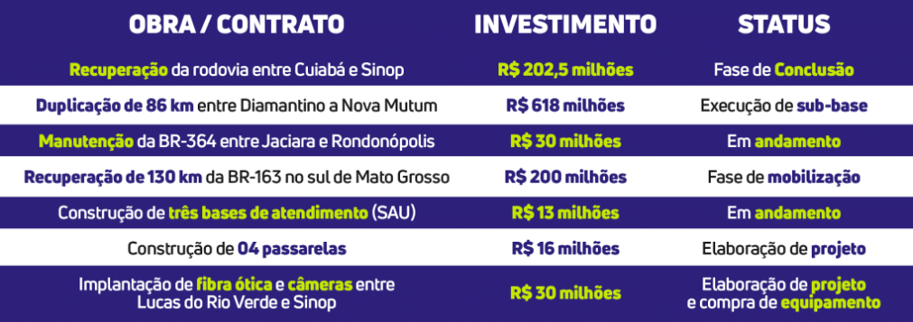 Desde que o Governo do Estado assumiu a concessão da BR-163, por meio da compra do controle acionário da Nova Rota do Oeste, em maio deste ano, a concessionária já contratou mais de R$ 1,1 bilhão em obras de infraestrutura na rodovia.