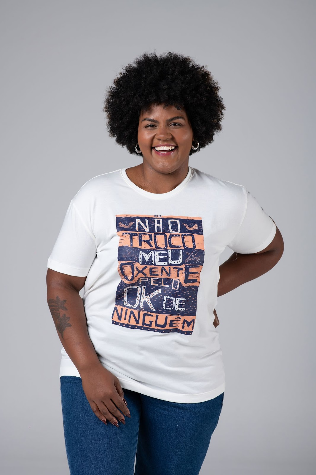A Camiseta Oxente com malha tradicional, possui material sustentável e é feita com 100% de fibra natural de algodão sustentável. E é estampada em processo de serigrafia.
