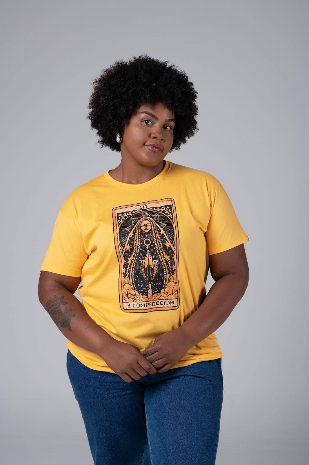 A Camiseta A Compadecida com malha tradicional, possui material sustentável e é feita com 100% de fibra natural de algodão sustentável. E é estampada em processo de serigrafia.