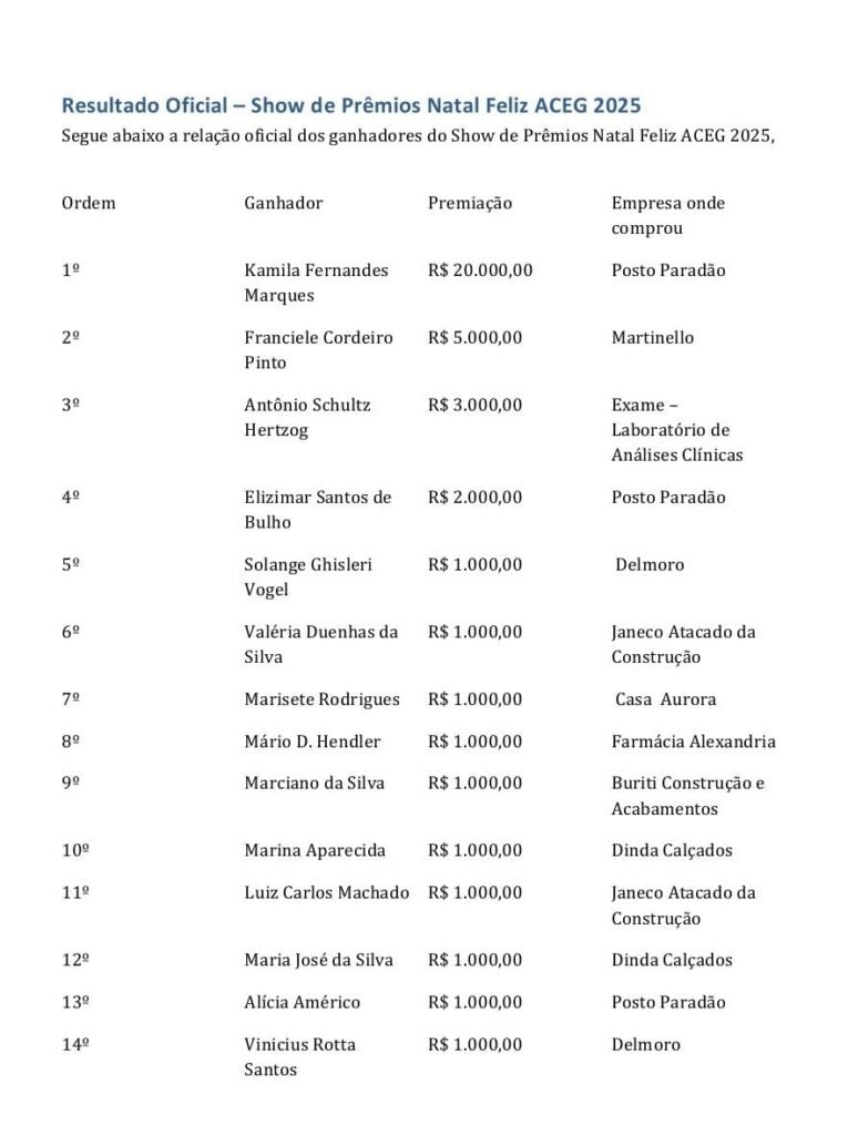 Além dos 40 mil reais, sorteados também foram distribuídos, muitos prêmios, surpresas sorteados para as pessoas que estavam acompanhando o sorteio, pela TV GA e redes sociais da ACEG.