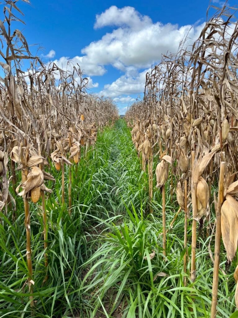 Outra estratégia é a semeadura do capim em linha, nas entrelinhas do milho, quando o cereal estiver entre os estádios V3 e V5. Nesse caso, a competição é naturalmente menor e não há necessidade de realizar o travamento do capim com herbicidas.